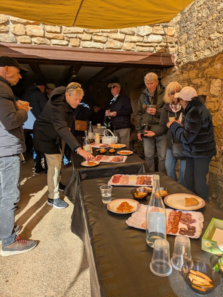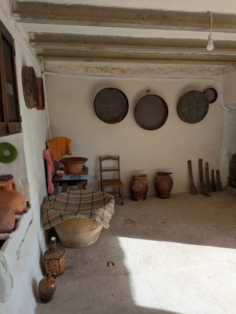 We then visited the restored farmhouse where we saw how life was lived all those years ago, and how the living space was shared with the animals. We learned how water had to be collected in earthenware jars, carried in panniers on horses/mules. A very generous tasting of some local products followed, and those who wished were able to purchase almonds and other home-made products.