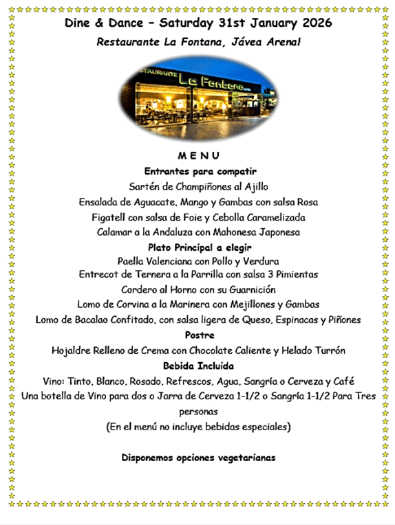 Our first get-together for the New Year will take place in Restaurante La Fontana which is located on the promenade in Jávea Arenal. See below for the great menu!