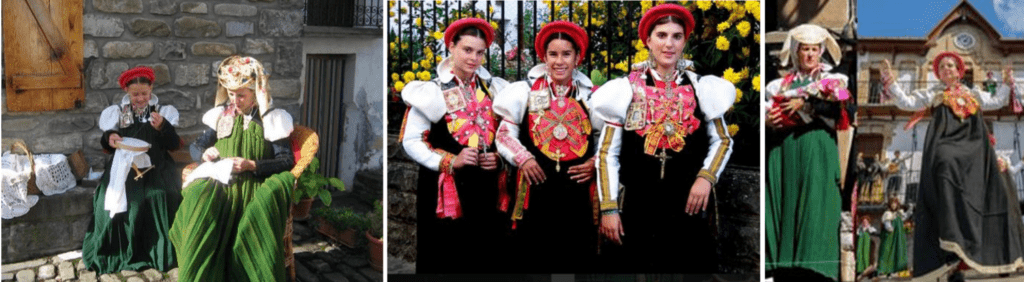 On the last Sunday of August, Ansó becomes a living museum of traditions with the celebration of Ansó’s Traditional Costume Day. This festival, declared a National Tourist Interest event, has been celebrated for over 50 years. More than 100 residents of Ansó dress in their finest attire and showcase the daily life of yesteryear.  Locals dress in their regional costumes, made of wool dyed red and green for women and black for men, adorned with details on the shoulders, chest, and head. This attire, one of the most beautiful and unique in Aragón, has been immortalized by artists like Sorolla and is a symbol of the cultural heritage of the valley. Baptismal costumes, “periquillo” outfits, brotherhood attire, and skirts are just some of the traditional costumes that can be seen each year.