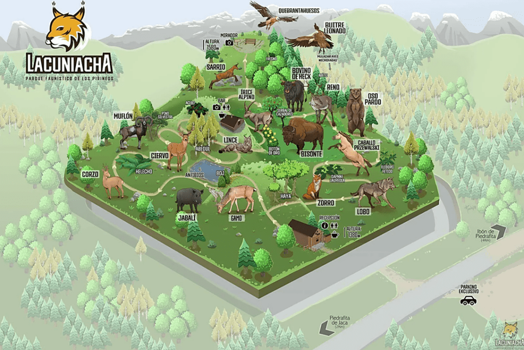 Lacuniacha Wildlife Park is a biopark of over 30 hectares located in the heart of the La Pinosa forest in the Tena valley and surrounded by the imposing Huesca Pyrenees mountains.  Here you can learn first-hand about the bears, wolves, lynxes and the many other species who live or have lived in the Pyrenees. The park is aimed at being a sanctuary for animals who are born in captivity, come from a recovery centre or have been rescued from places where they did not receive appropriate care. There are around 120 animals of 15 different species and apart from living in their own habitat, these species coexist and interact with other animals who roam around freely and can enter and exit the park perimeter without any problem, such as moles, marmots, squirrels and birds.