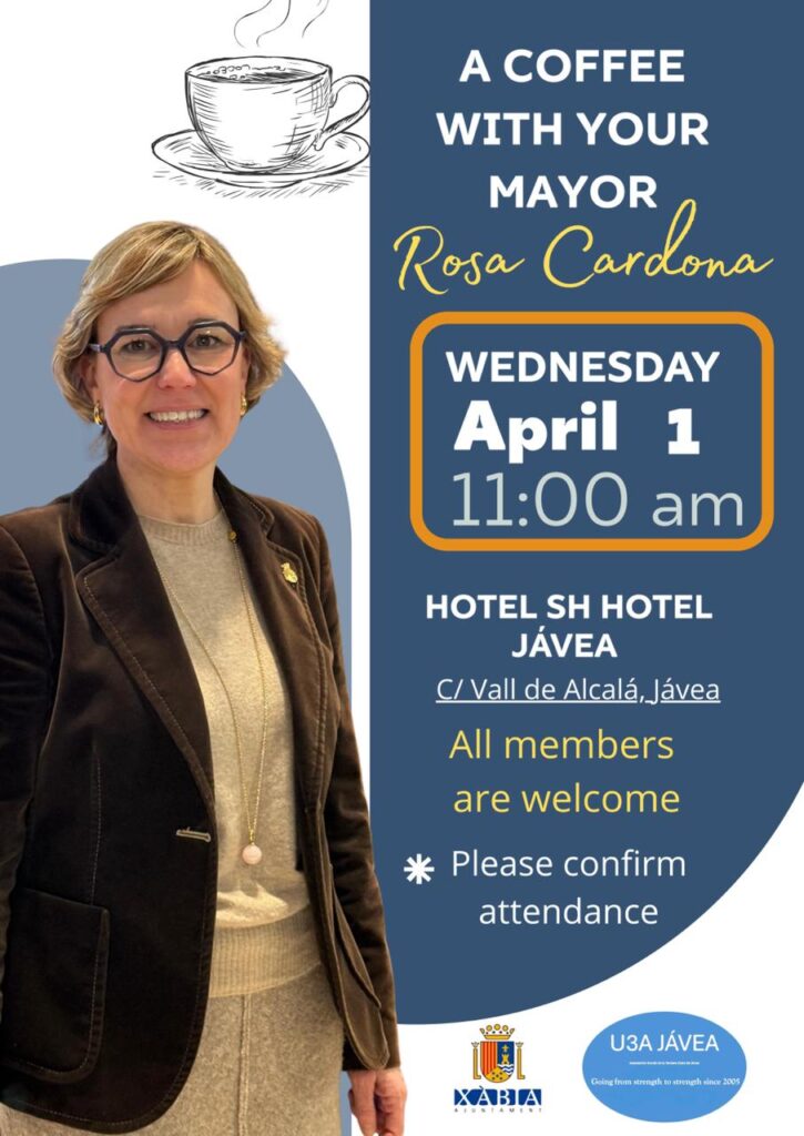Rosa Cardona Mayor of Javea, invites all members of U3A Javea who live in Javea to meet her and Raquel Violero Castellanos the Councillor for Social Services, the Third Age and Foreigners on 1 April 2026 to enjoy a coffee with them at the new SH Hotel in the Port.